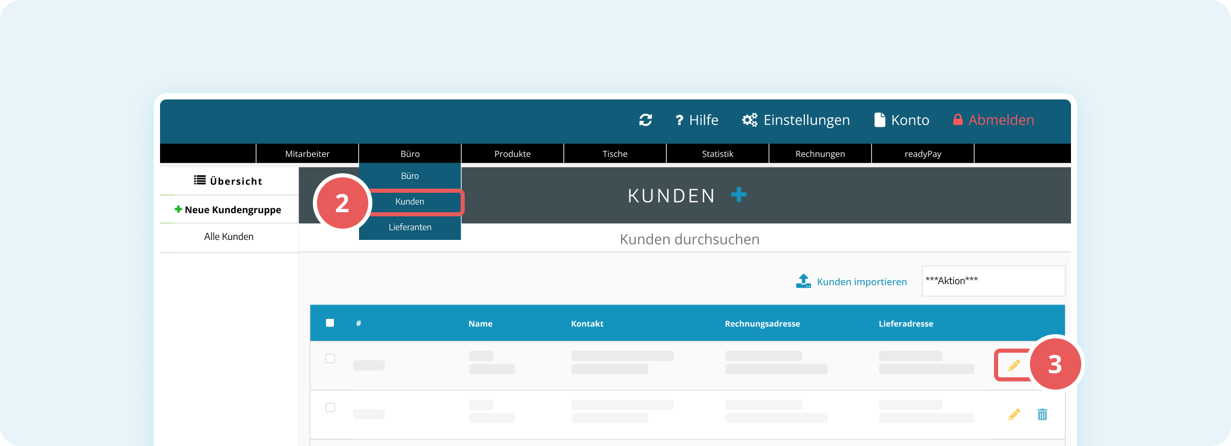 2. Fahre mit der Maus oben im Hauptmenü auf Büro und wähle im Dropdown-Menü Kunden aus.