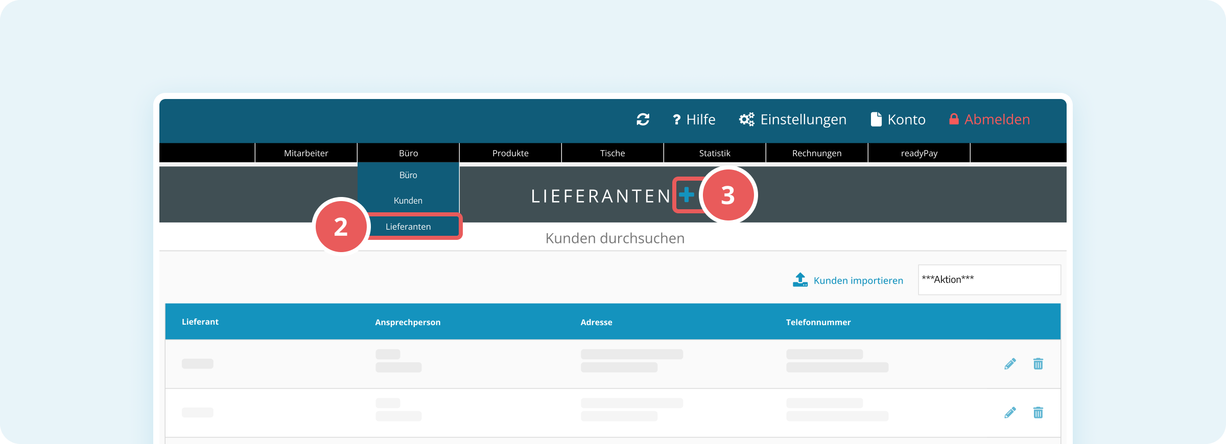 - Klicke im Hauptbereich neben LIEFERANTEN auf das blaue Plus-Symbol (+).