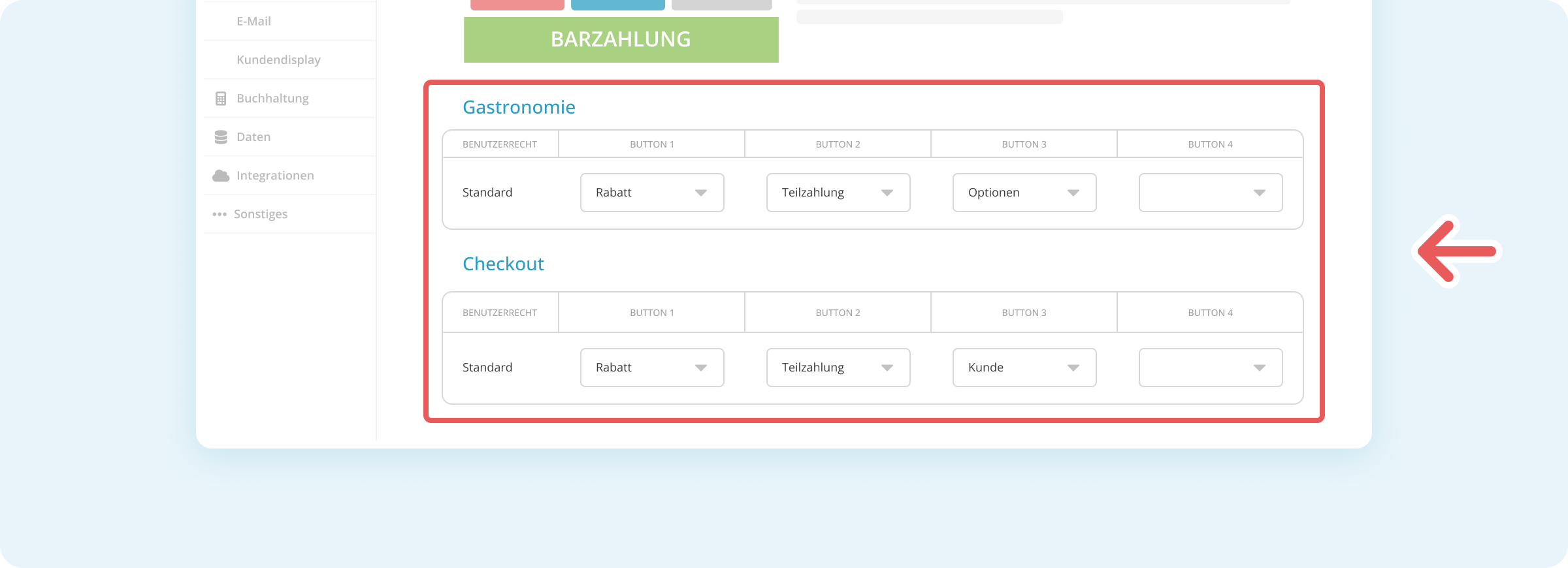 - Wähle aus den Dropdown-Menüs die gewünschten Funktionen für die einzelnen Buttons 1 bis 4 aus.Hinweis: Wenn du das Gasto-Paket nutzt, kannst du die Schnellzugriffe für Checkout und Gastronomie separat konfigurieren.