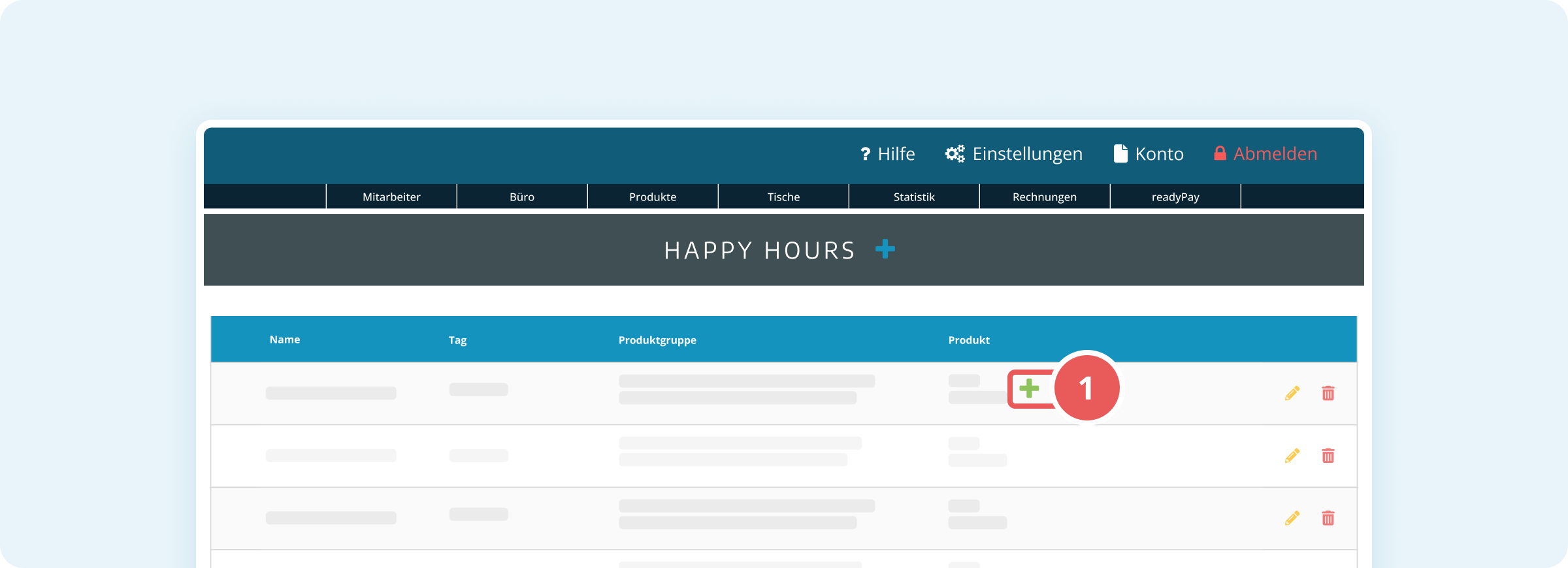 - Klicke in der Happy Hour Übersicht in der Spalte Produkte auf das grüne Plus-Symbol neben der gewünschten Happy Hour.