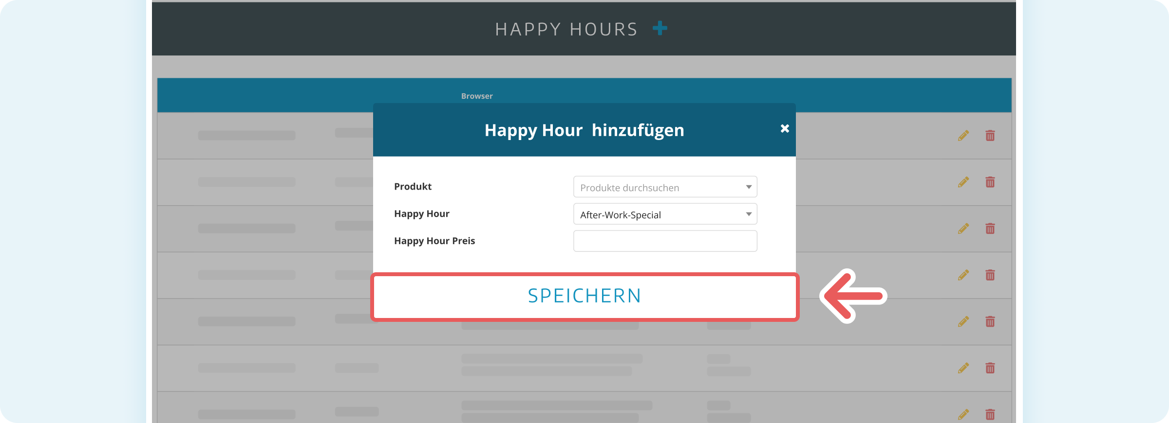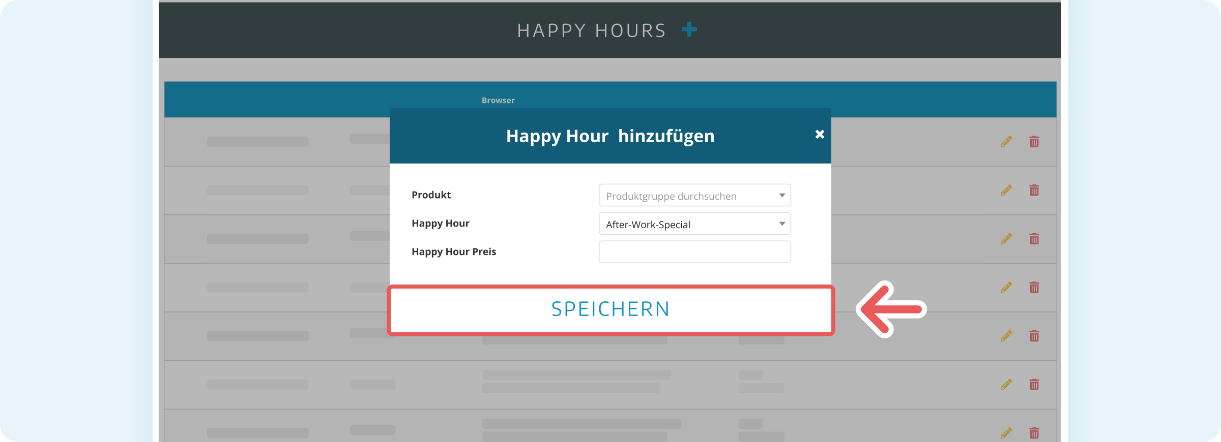 - Klicke neben der Überschrift HAPPY HOURS auf das blaue Plus-Symbol.
