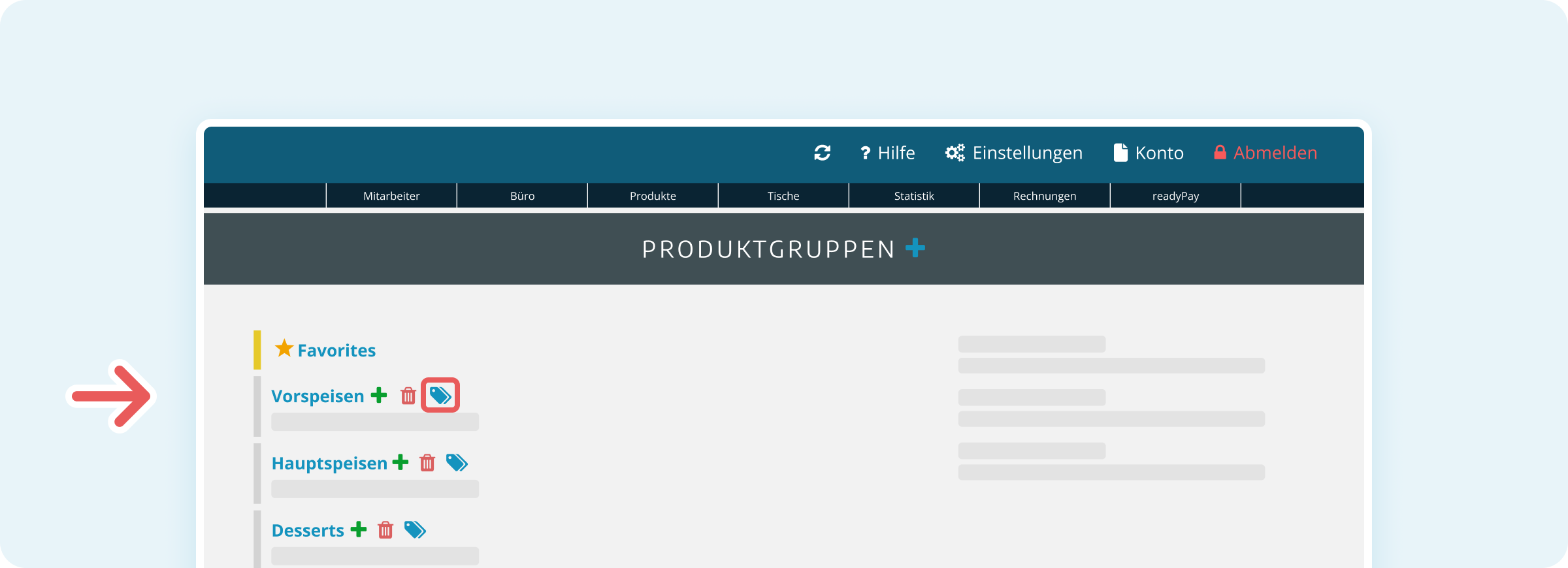 - Klicke rechts neben der Überschrift "PRODUKTGRUPPEN" auf das Plus-Symbol (+), um eine neue Produktgruppe anzulegen.