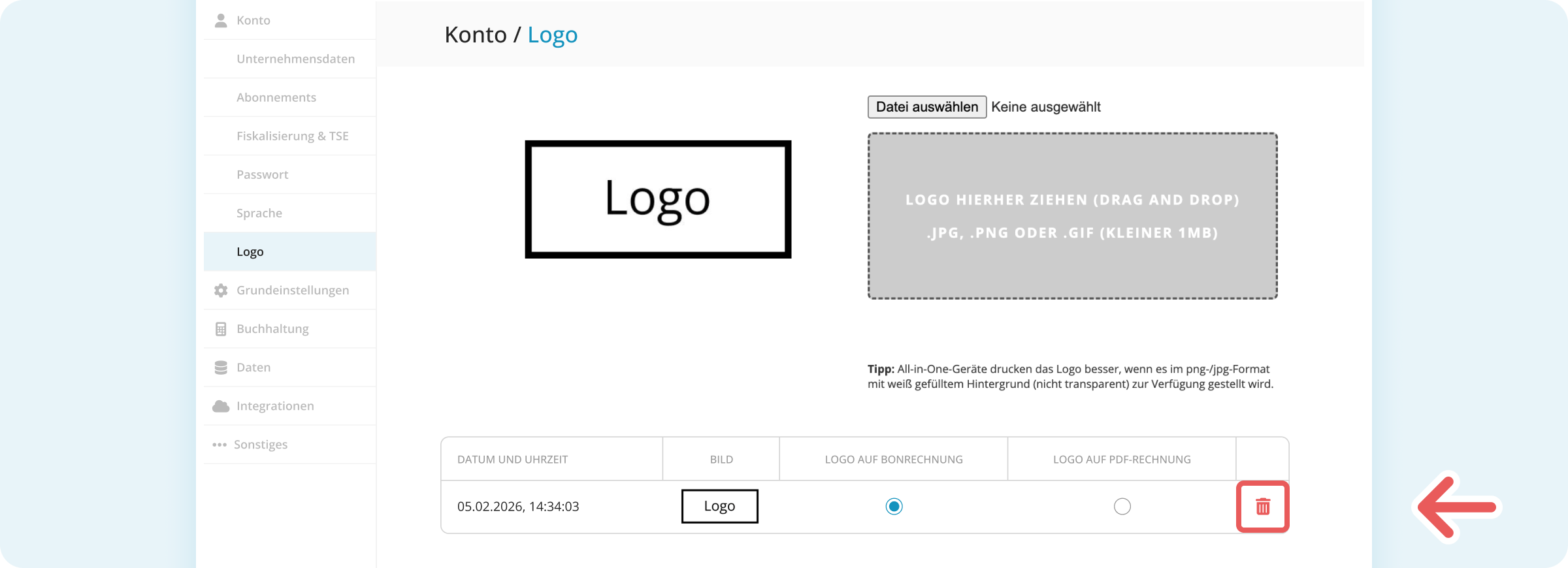 Das Logo wird sofort entfernt und erscheint nicht mehr in der Software oder auf neuen Belegen.