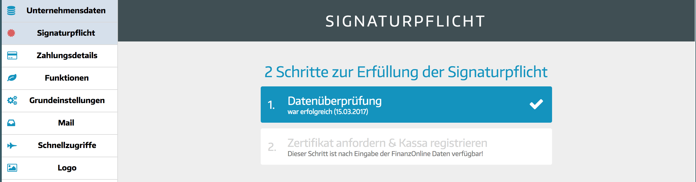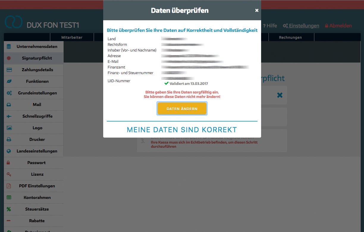 - Gehe unter Einstellungen zum Unterpunkt "Signaturpflicht" und wähle "Datenüberprüfung" aus.