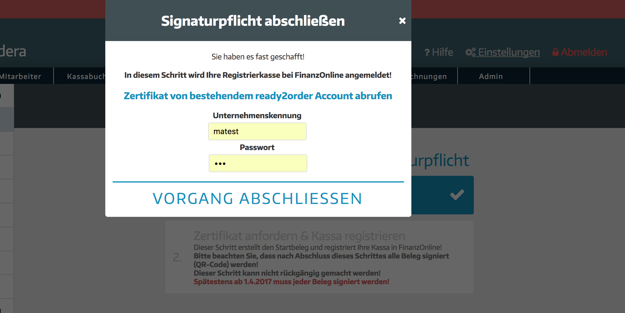 - Hier musst du nun die Daten vom bestehenden ready2order Account eingeben: