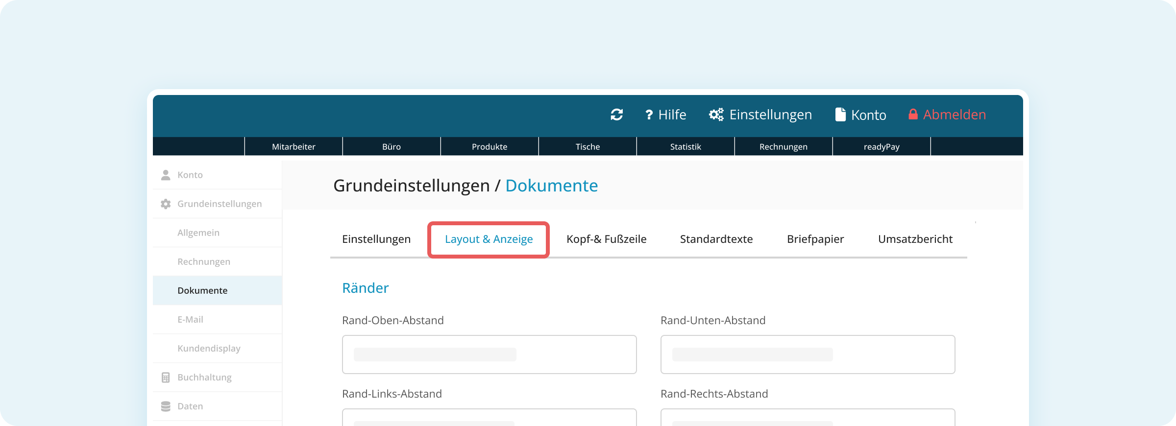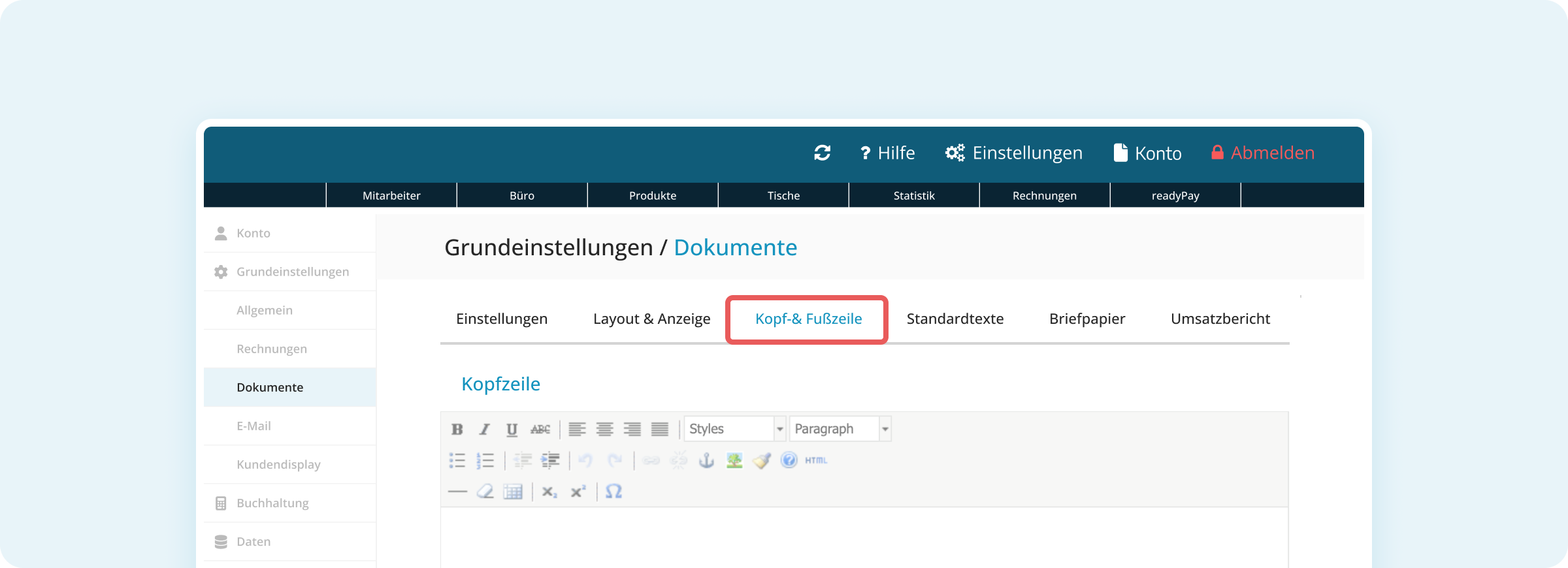 Du siehst nun die Dokumente-Einstellungen mit mehreren Tabs: Einstellungen, Layout & Anzeige, Kopf- & Fußzeile, Standardtexte und Briefpapier.