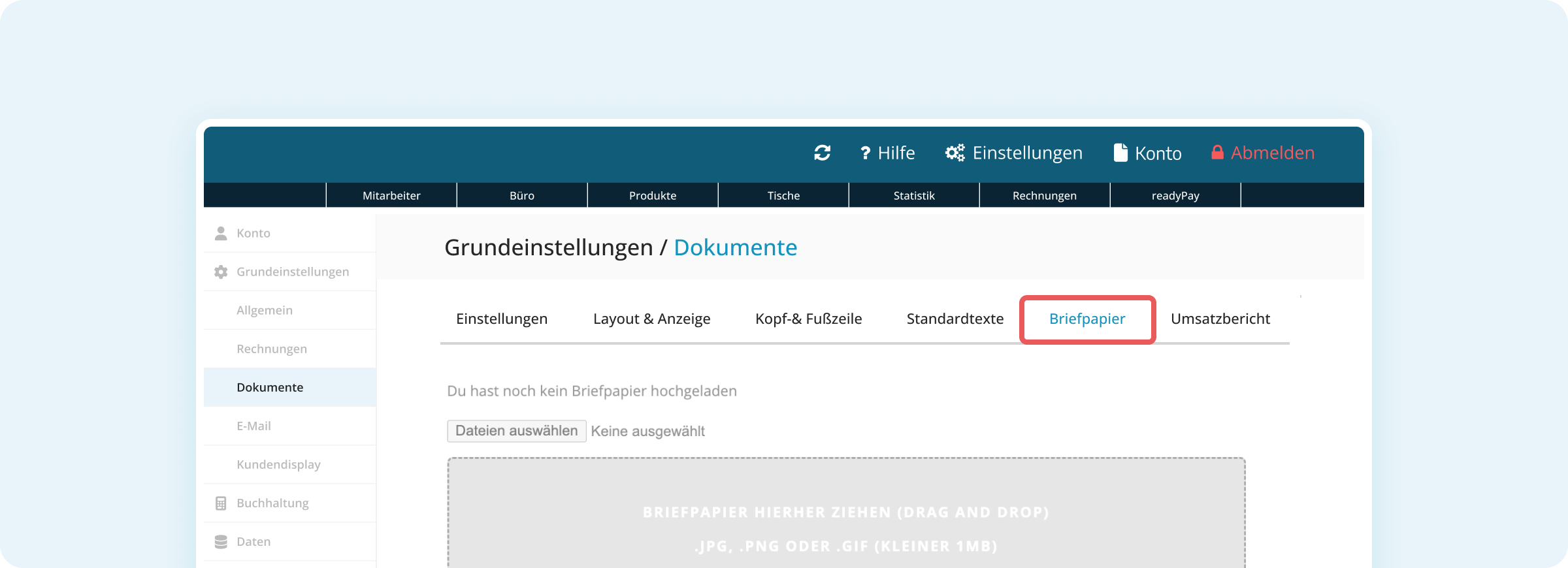 Im Tab Briefpapier kannst Du Dein eigenes Briefpapier hochladen, auf das Deine Dokumente gedruckt werden.