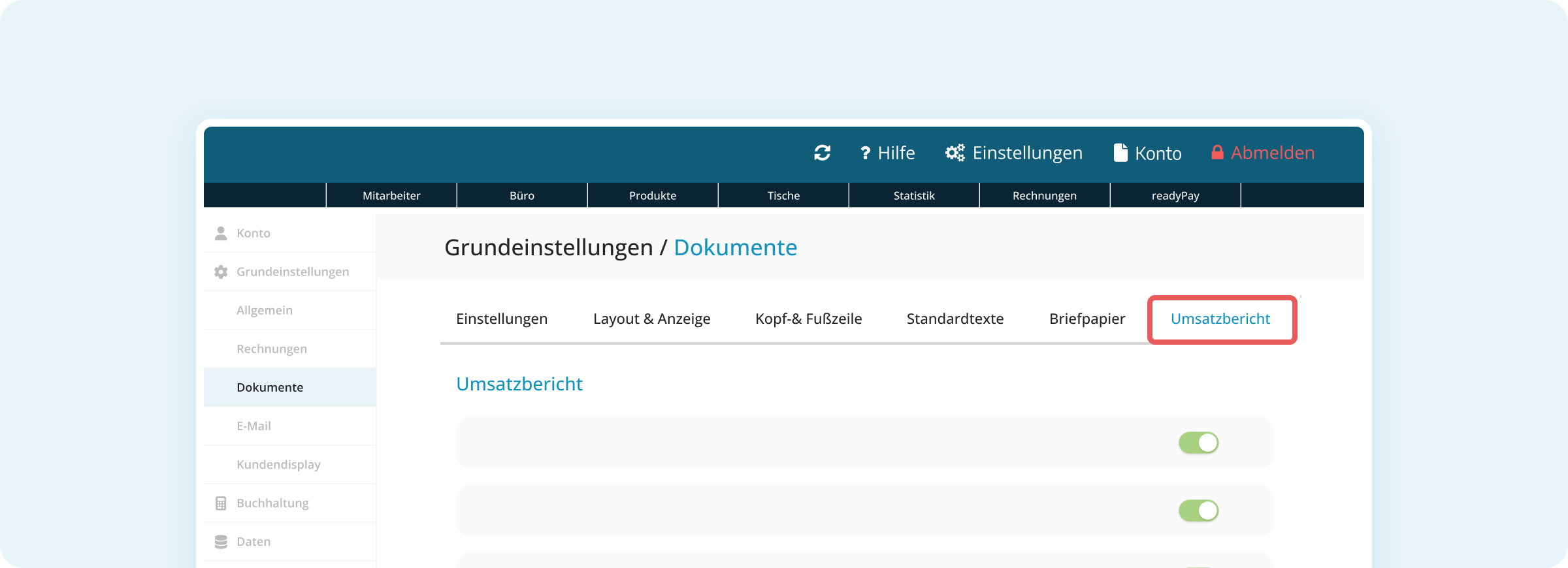 Im Tab Umsatzbericht kannst Du einstellen, welche Informationen auf Deinen Umsatzbericht gedruckt werden: