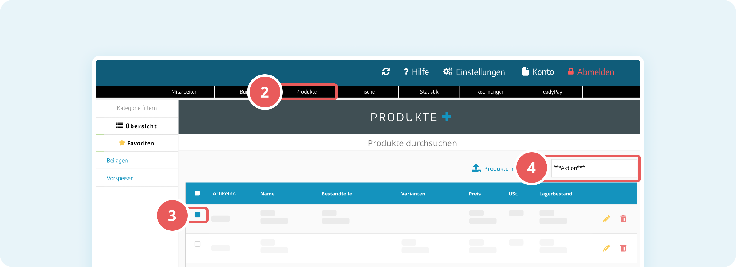 - Produkte aktivieren: Macht die Produkte in der Kassenoberfläche sichtbar und verkaufbar.