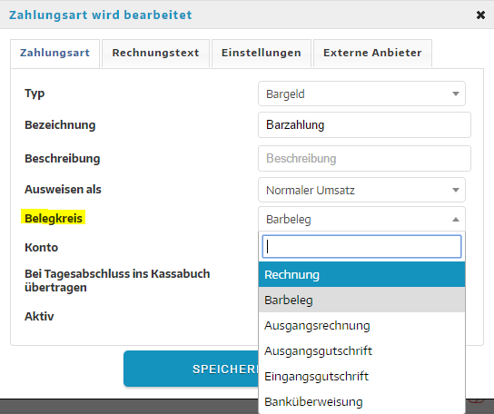 Anschließend kannst Du hier den Belegkreis auswählen. Wenn bei allen Zahlungsarten fortlaufende Rechnungsnummern gewünscht sind, muss der Belegkreis bei jeder Zahlungsart derselbe sein.