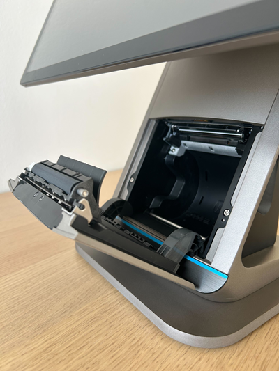 - Lege nun die Bonrolle, wie auf dem folgenden Bild ersichtlich, ein. Achte darauf, dass ein Teil der Bonrolle über die Abdeckung gelegt wird.