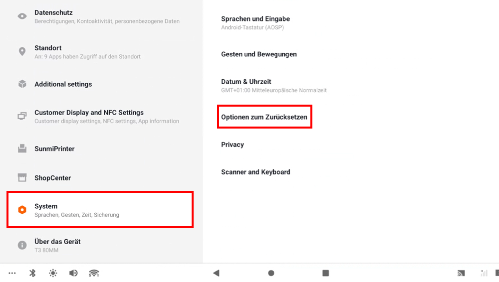 - Wische auf der linken Seite des Menüs nach unten, wähle System und dann auf der rechten Seite Optionen zum Zurücksetzen.
