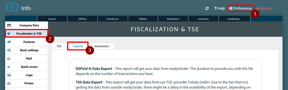 In your Admin Interface you'll find all relevant exports and documents for the TSE/TSS (Technical Security System). These exports are used for documentation and submission to the tax office.