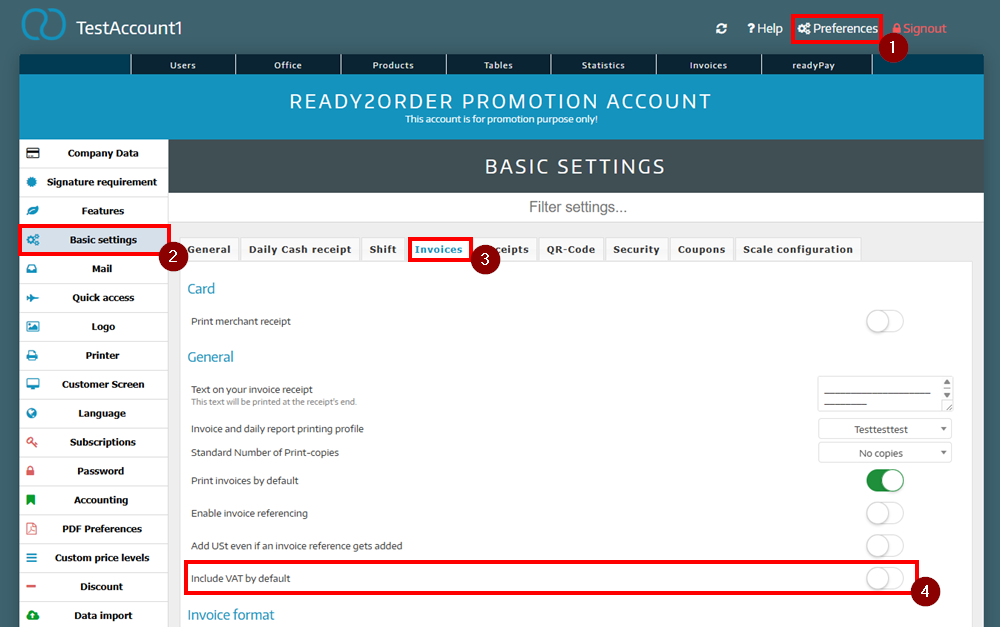 If you want to enable or disable the printing of hospitality receipts on your invoices by default, you can set this in your Admin Interface. To do this, proceed as follows:
